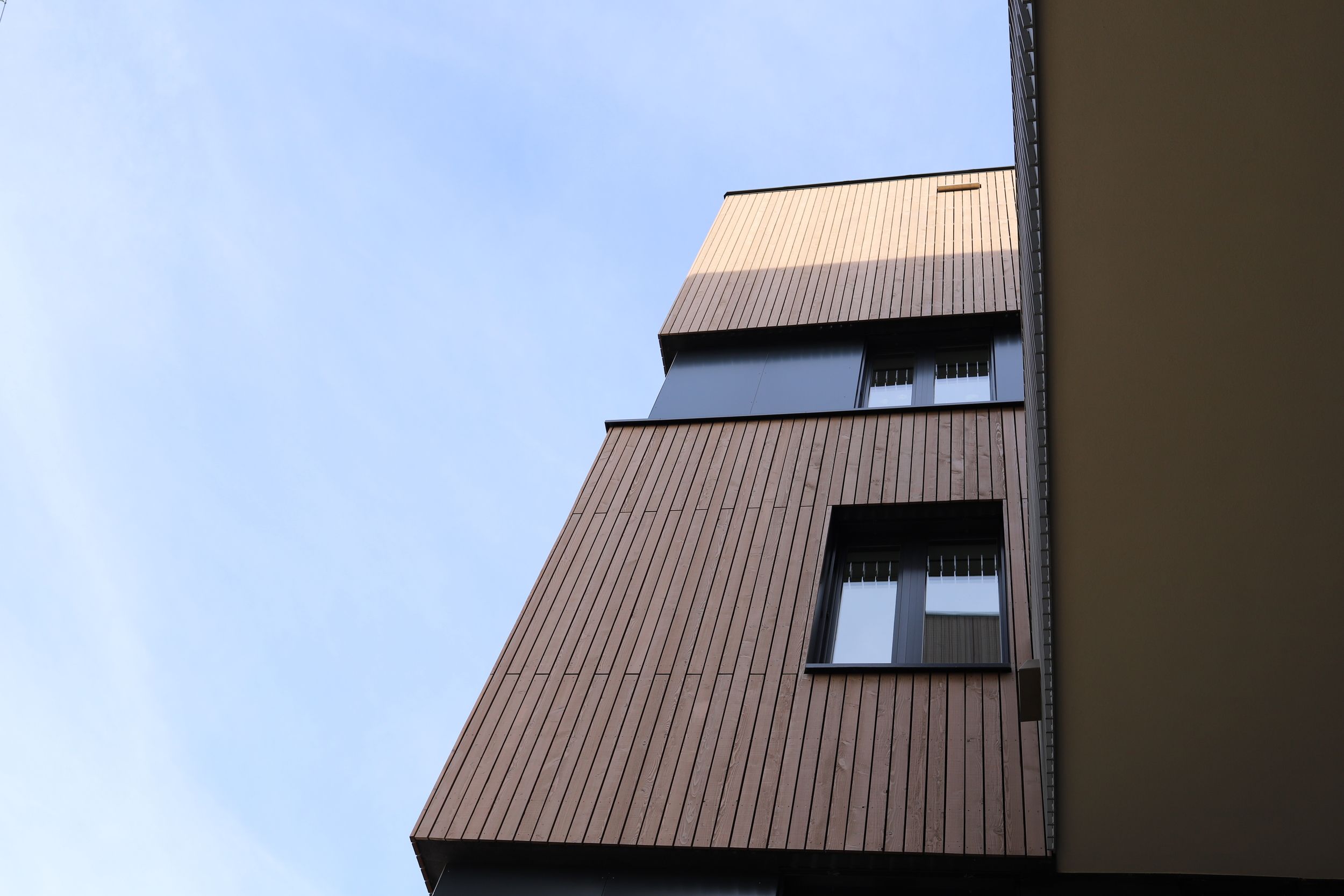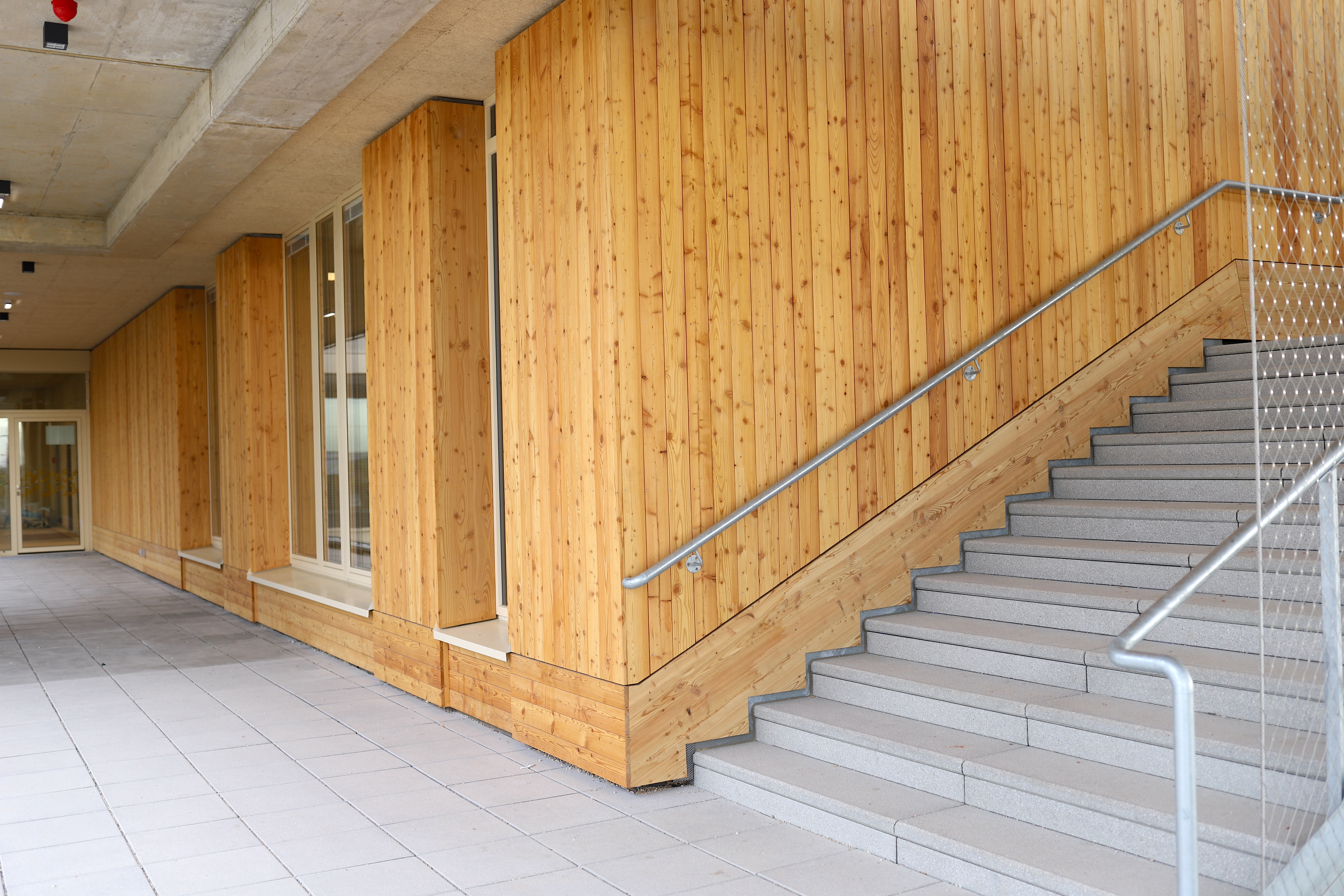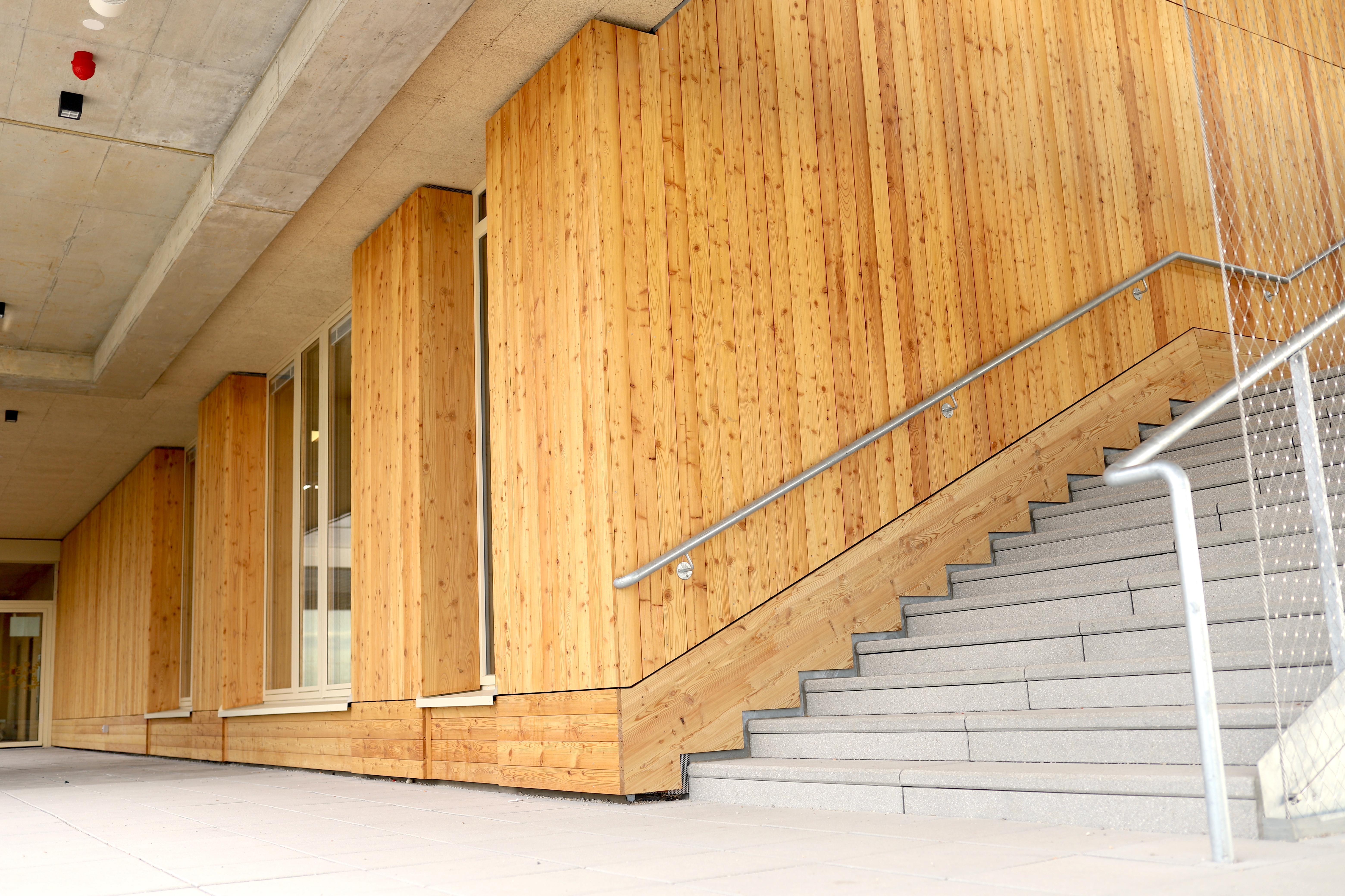 Eine in Wien errichtete Lärchenfassade für eine Volks- und Mittelschule.